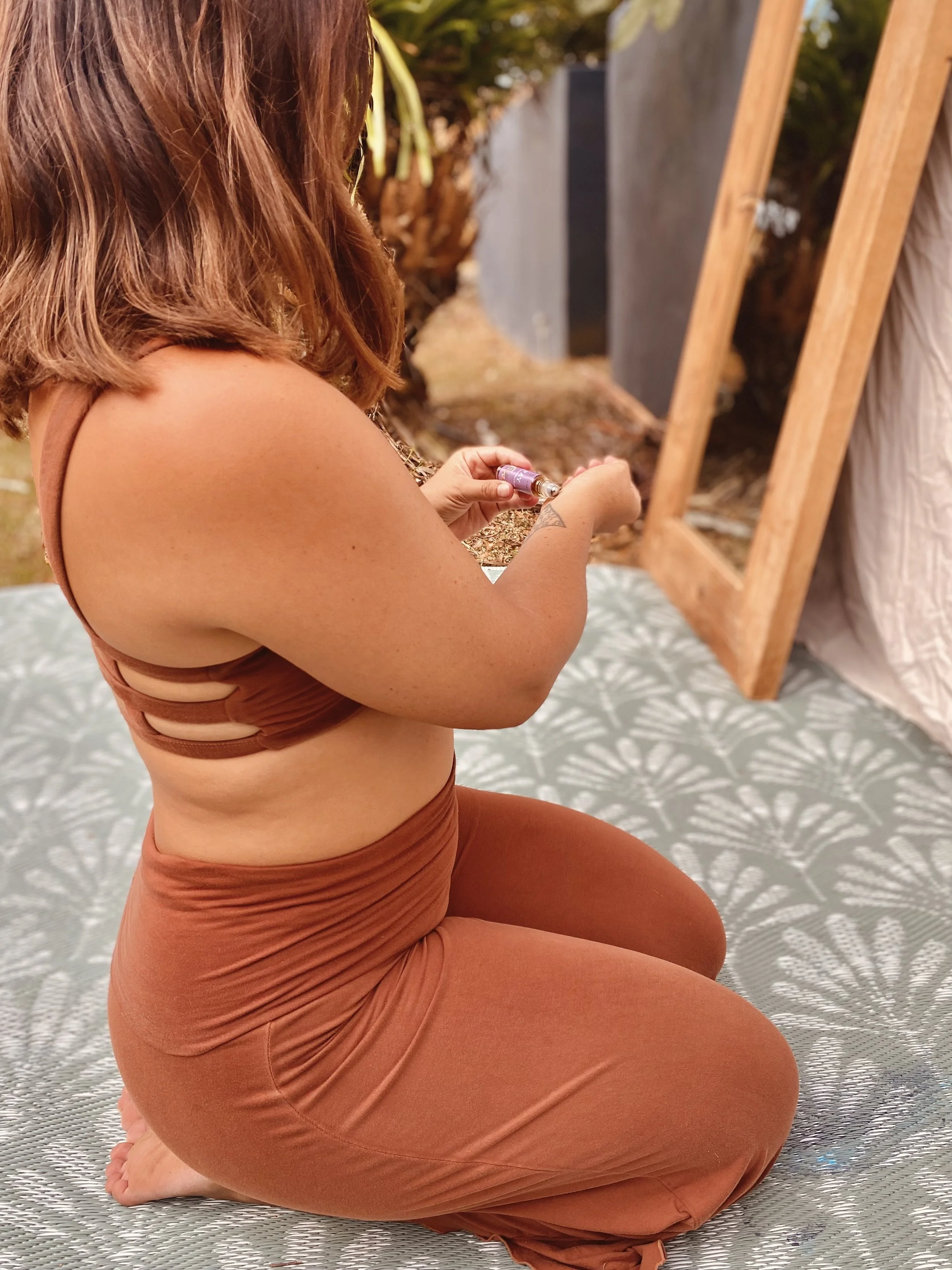 This hand crafted roller is created with organic essential oils that are known for their mood enhancing, aphrodisiac qualities such as; Jasmine, Ylang Ylang + Rose petals.